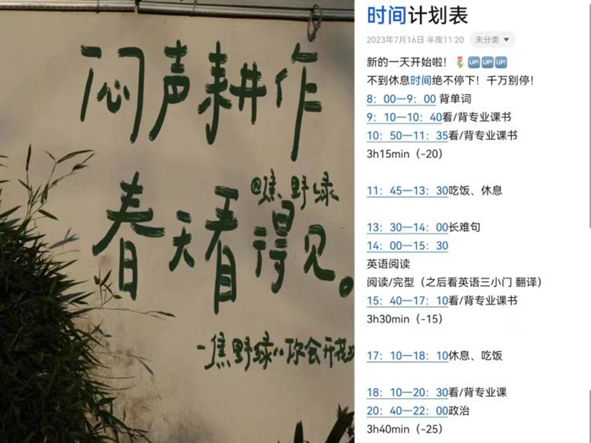 心态调整:姚欣莹谈到,“信心和失落是不断交替出现的,这很正常”。她通过一些话敦促自己,比如用“一日难再晨”催促自己抓住早上的时间,再比如用“道阻且长,行则将至”来激励自己坚持下去。