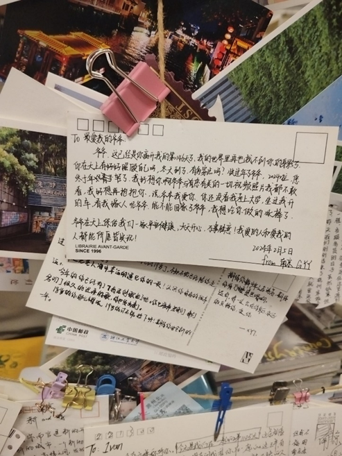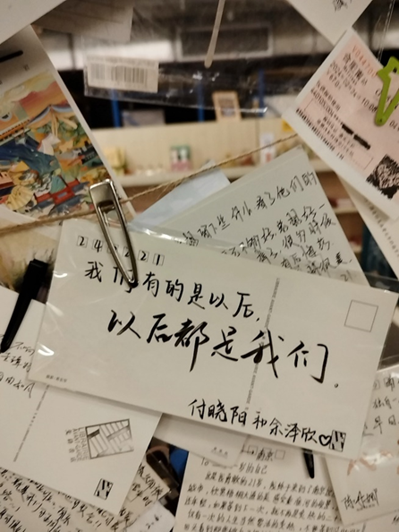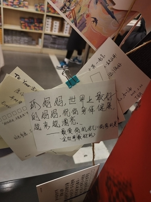 那面明信片墙上,一位即将毕业的大四学生以十八张车票串联起她的青春,她致敬着来去匆匆的光阴并向驻足的人说:“世间是世间,我是我。”另一隅,泛黄的信纸承载着远行的人对母爱的歌颂,他们竭力用着轻松的笔触对着远方的妈妈说再见:“妈妈,我很好,请不要为我担心”、“我已不想再去跟你说她有多伟大,只请你低头看一眼她的白发”……