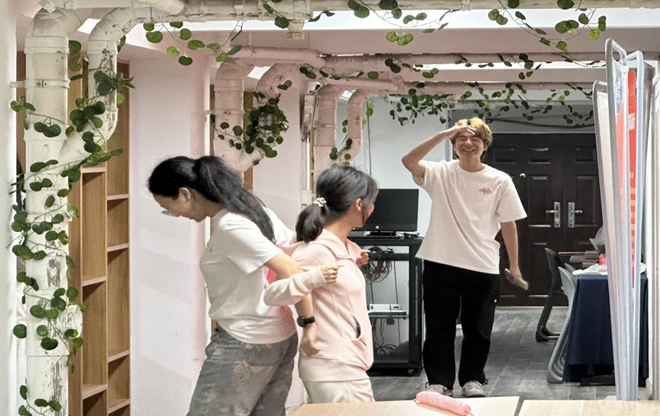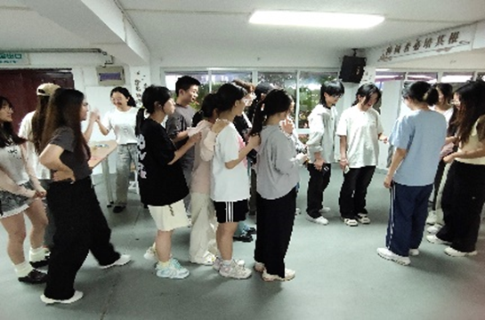 游戏开始,大家先在音乐中自由漫步着,随后主持人吹哨发出信号,每位同学与相遇者通过石头剪刀布分出胜负,胜者为龙头,输者拉住衣角跟随赢家。不知不觉间,20位同学们在这简单的游戏里相互建立起了联系,被轻轻拉起的衣角,是连接彼此的心灵的小桥。