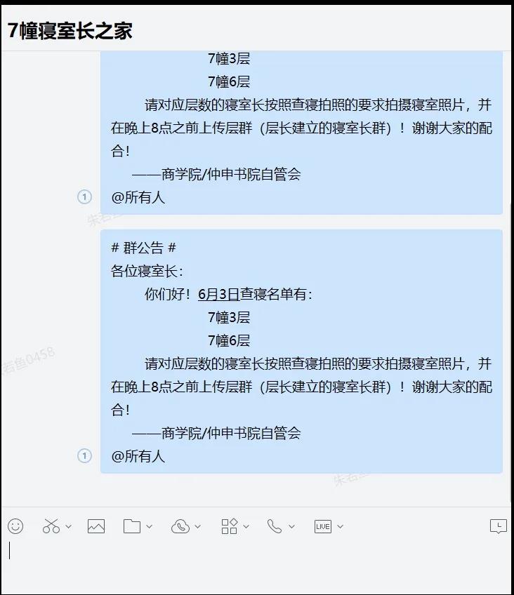 5、查寝人员于当晚22:00之前评分完毕,将不合格寝室的截图信息报送组长。
